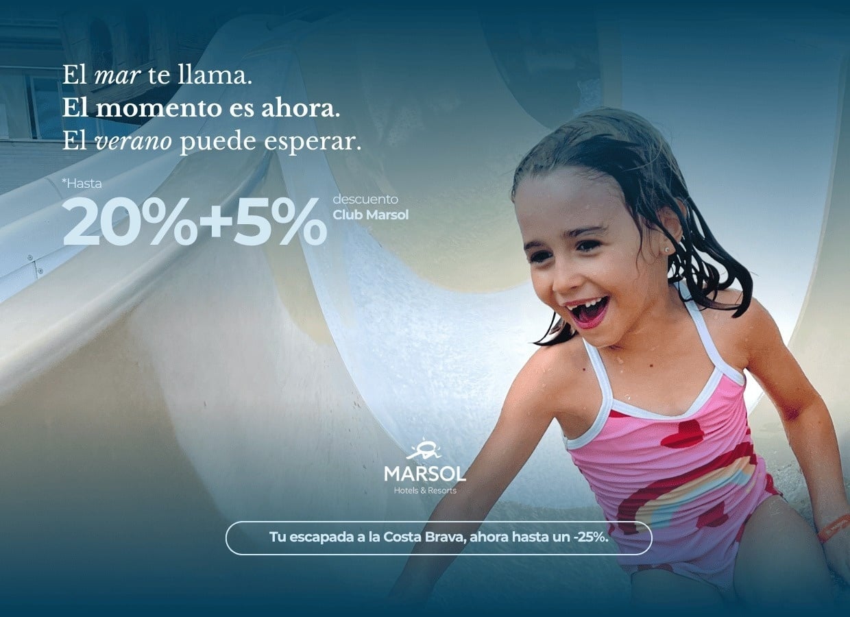 • Una niña sonriente en un tobogán de agua promociona una oferta de Marsol Hotels & Resorts para una escapada con descuento a la Costa Brava.