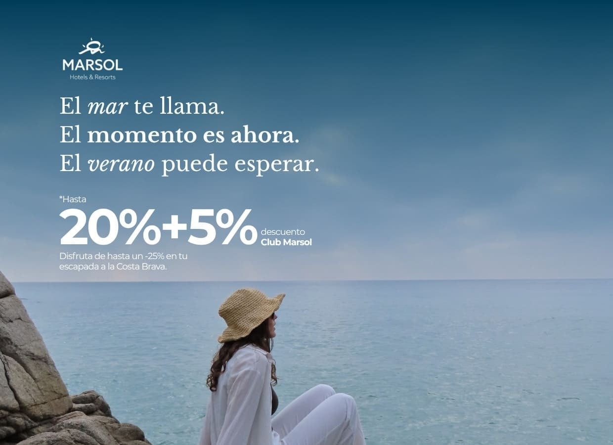• Una imagen publicitaria de Marsol Hotels & Resorts muestra a una mujer contemplando el mar, promocionando una escapada a la Costa Brava con descuentos de hasta el 25%.